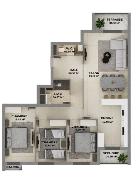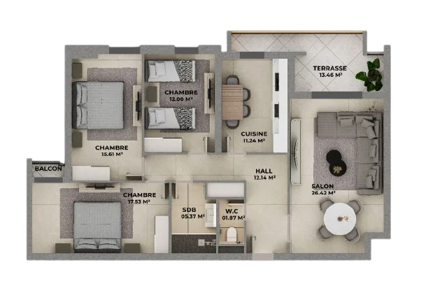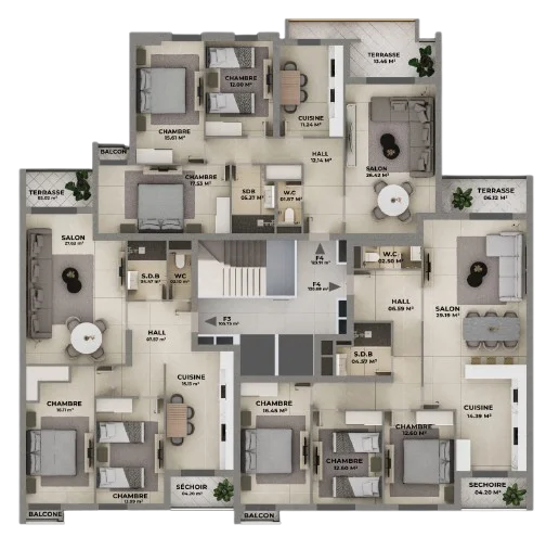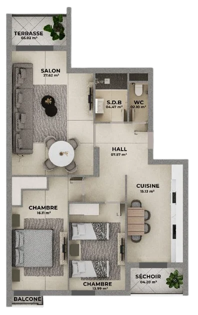 La résidence est conçus pour favoriser la lumière naturelle et la circulation de l’air, les appartements de la résidence offrent des espaces de vie généreux et chaleureux. Chaque logement bénéficie de finitions soignées et d’un agencement fonctionnel, adapté aux attentes des familles, couples ou investisseurs.
